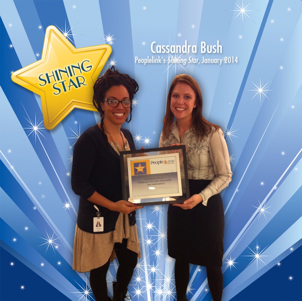 Peoplelink is pleased to announce that Cassandra Bush has been chosen as our January Shining Star employee. Cassandra is a Recruiting Coordinator at ServiceSource. She reports to the Nashville, Tennessee Peoplelink branch.